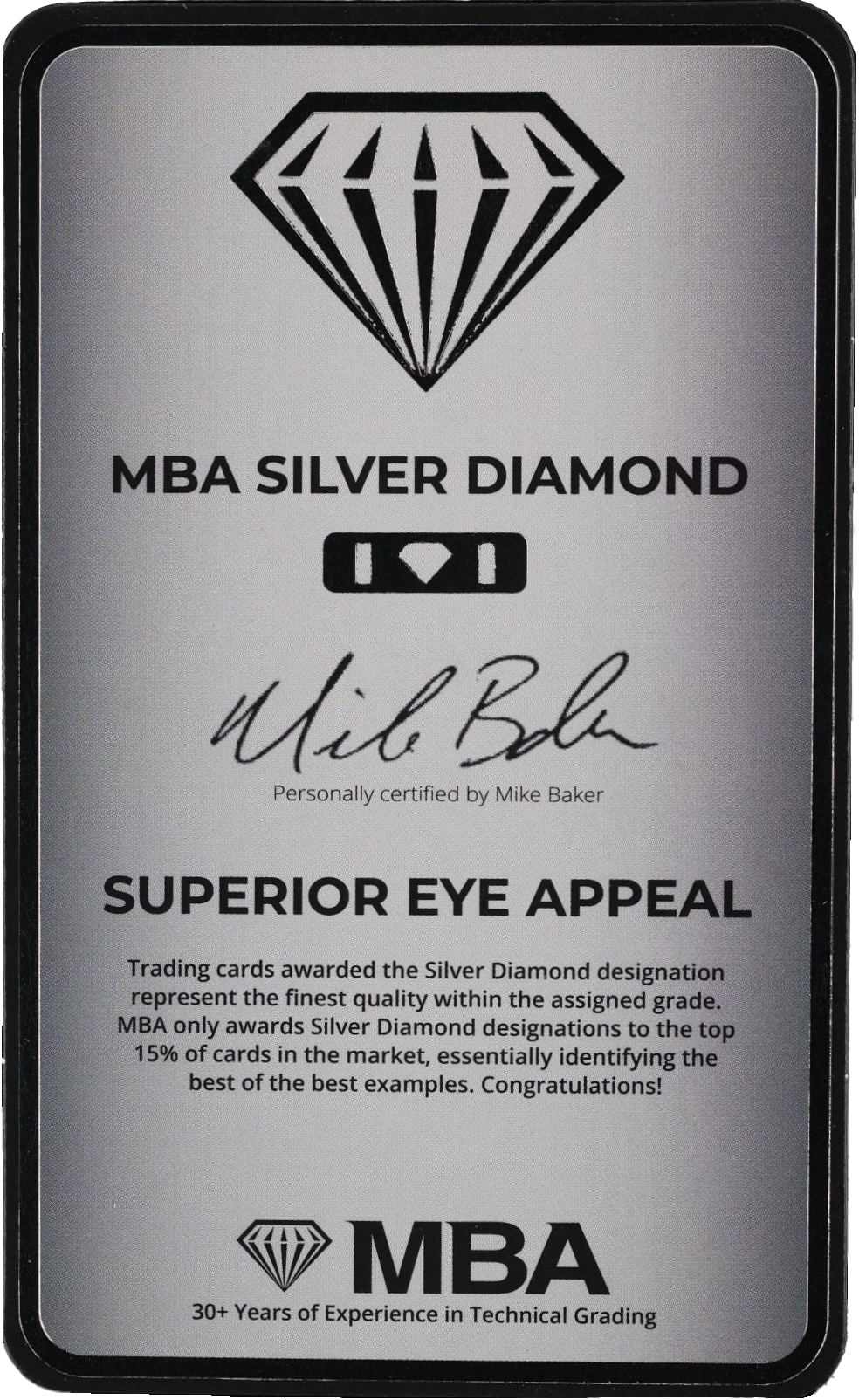 Candidates identified through the Diamond Digital Review service generally achieve Silver, Gold, or Black Diamond awards 3x more often than cards not submitted for review in advance. The likelihood of being in the top 15% of quality is determined through the review of digital images using MBA grading expertise and the MBA Grading Standards. Candidates must be formally submitted to MBA for Diamond Certification service for official determination because the Diamond Digital Review does not guarantee a particular outcome.