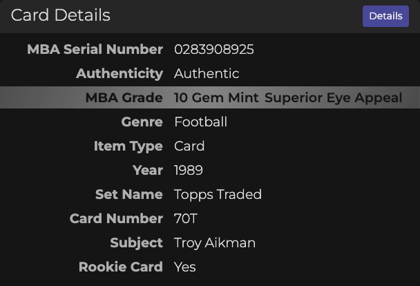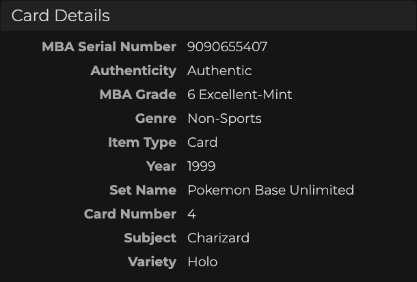 MBA maintains a robust online database of all MBA authenticated, certified, and graded cards, including population statistics, card listing details with metadata to write card titles and descriptions, and a scannable 2D barcode.