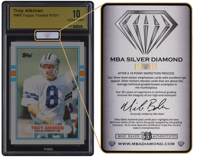 MBA Silver Diamond is awarded to trading cards with Superior Eye Appeal. MBA experts will assign Silver Diamond awards to MBA graded cards when warranted, generally highlighting the top 15% of cards with that grade.